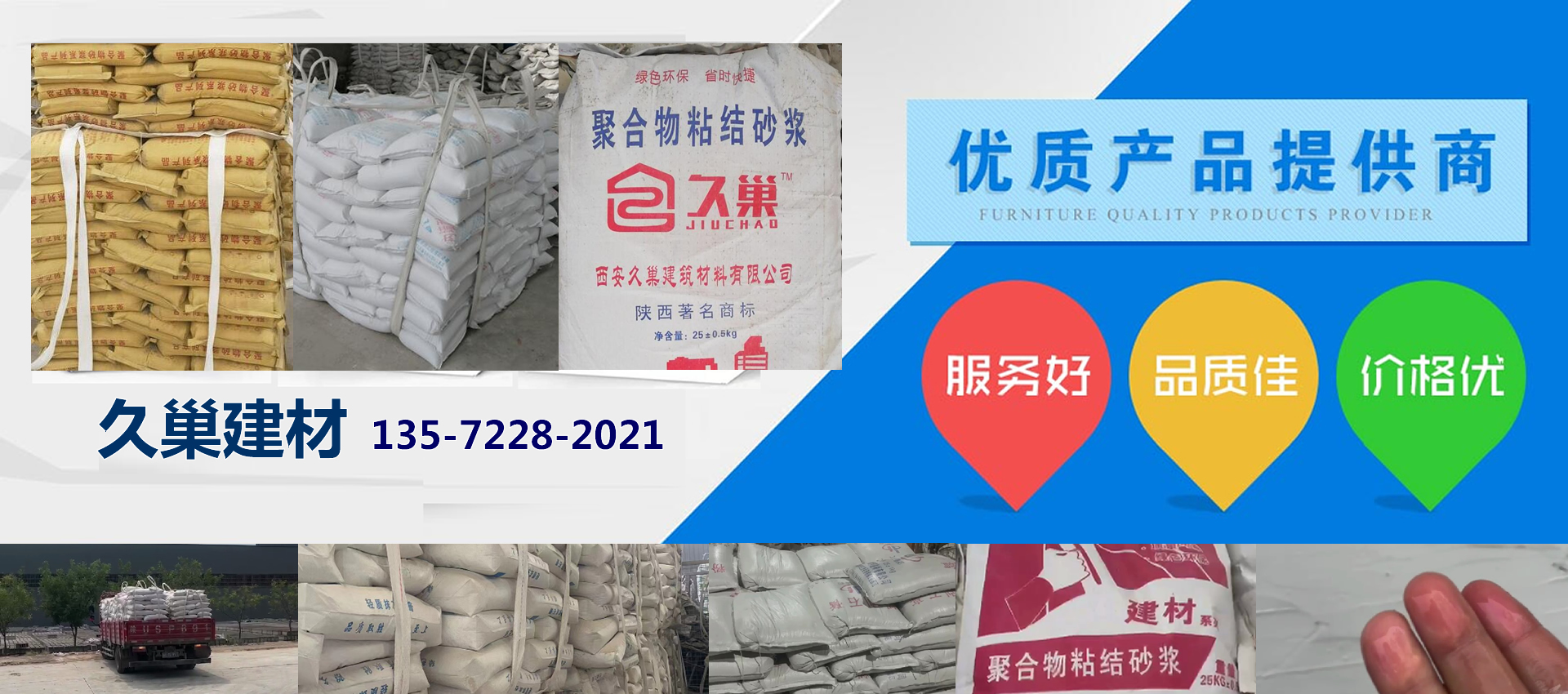 西安久巢建筑材料有限公司專業提供陜陜西保溫砂漿,陜西抹面砂漿,陜西聚合物抗裂砂漿,陜西加氣塊專用砂漿,陜西膩子粉,陜西輕質抹灰石膏,西安輕質抹灰石膏等防水材料。依托卓越技術品質,憑借良好的信譽魅力,工廠現己發展成為一家開發、生產、銷售、施工和售后服務集成為一體的綜合性膩子粉生產企業。西安久巢建筑材料有限公司建立起嚴格的管理規范制度,生產的系列建筑保溫防水材料產品成功應用于包括房屋建筑、高速公路、城市道橋、地鐵及城市軌道、高速鐵路、機場等眾多領域。陜西保溫砂漿,陜西抹面砂漿,陜西聚合物抗裂砂漿,陜西加氣塊專用砂漿,陜西膩子粉,西安膩子粉,西安膩子粉廠家,西安粉刷石膏,西安粉刷石膏價格,西安輕質抹